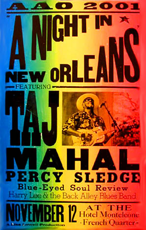 | "A NIGHT IN NEW ORLEANS - Media Rescue" has been conceived of because not only of the tragic events and effects of Hurricane Katrina in the Louisiana and Mississippi regions of the US, but because the media effect on the public at large seems psychologically cruel. We all understand that the press usually delivers bad news, and although we do want to see what happened there, "good-news" broadcast features are usuallly limited to local news stories about finding a family cat in a tree. We were invited to beautiful New Orleans by singer / producer Lisa Lowell to cover "A Night In New Orleans" at the Hotel Monteleone in NOLA's French Quarter. New Orleans has always been known for great food and great music and after spending a week in NOLA we agree there has been no better city combing the two almost every minute of everyday. A Night In New Orleans featured the amazing talents of TAJ MAHAL, PERCY SLEDGE, HARRY LEE and THE BACK ALLEY BLUES BAND, and BLUE EYED SOUL REVIEW. Finally, after weeks, the media is cutting back on tthe use of its' devastating imagery. We wanted to bring out some of the more positive images of New Orleans to both remember what was, and to what we can look forward to again in the future. As the region desperately tries to come to grips with the physical and emotional scars that history will no doubt mark as the worst natural disaster in the United States, the waters subside, families continue to grieve and we all share their sorrow. Please donate time, resources or money thought the American Red Cross or other sactioned organizations. CLICK IMAGE ON RIGHT FOR PIX |
